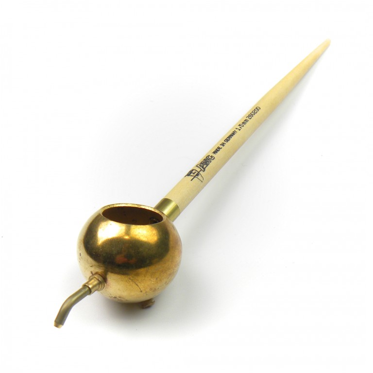 Tjan Ting 35mm/1,0mmTjanting slouží k nanášení vosku např. na látky. Je vyrobený z lité mosazi a jeho sférická miska udržuje vosk tekutý. Okamžikem, kdy se trychtýř dotkne pracovní plochy, vosk začne téct, což zabraňuje tomu, aby vosk kapal na nežádoucí místa. Malý trychtýř o průměru 1,5 mm vytváří středně široké linky. Tento nástroj s větší kapacitou je ideální pro práci na velkých batikových vzorech, kde je zapotřebí větší množství vosku.