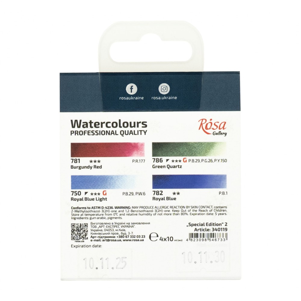Umělecké akvarelové barvy Gallery od ukrajinského výrobce Rosa představují kvalitní barvu s vysokým obsahem pigmentu a ověřenou recepturou. Vyrábějí se na bázi přírodní arabské gumy, která je základem všech akvarelových barev. Vyvinutí těchto barev probíhalo (a do určité míry stále probíhá) ve spolupráci s výraznými umělci, díky čemuž se barvy řadí světově mezi špičku. Navíc jsou za velice dobrou cenu. Dárková dřevěná kazeta. Tuby obsahují 10 ml barvy.