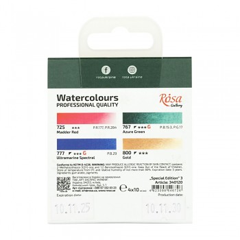 Umělecké akvarelové barvy Gallery od ukrajinského výrobce Rosa představují kvalitní barvu s vysokým obsahem pigmentu a ověřenou recepturou. Vyrábějí se na bázi přírodní arabské gumy, která je základem všech akvarelových barev. Vyvinutí těchto barev probíhalo (a do určité míry stále probíhá) ve spolupráci s výraznými umělci, díky čemuž se barvy řadí světově mezi špičku. Navíc jsou za velice dobrou cenu. Dárková dřevěná kazeta. Tuby obsahují 10 ml barvy.