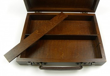 Luxusní dřevěný kufřík na barvy malýLuxusní dřevěný kufřík na barvy opatřený koženým držadlem a dvěma uzávěry. Kufřík je namořen na tmavě hnědou barvu, která má však plně přírodní vzhled. Uvnitř je rozdělen dvěmi vyjímatelnými přihrádkami, díky kterým je možné jej upravovat dle velikosti používaných barev.