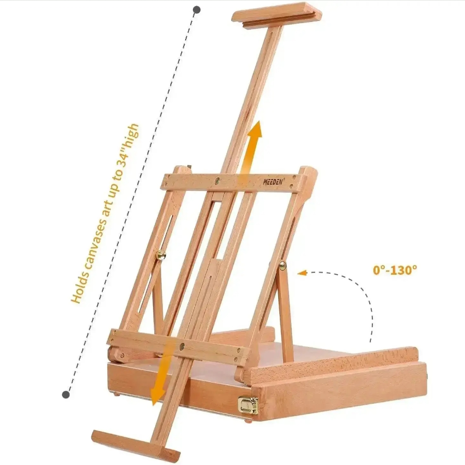 Kufříkový stolní stojan Meeden 6066Dřevěný umělecký stojan s kufříkem vhodný i na malování na cestách. Ručně vyrobený z masivního evropského bukového dřeva s mosazně pokovenými prvky a koženou rukojetí pro snadné přenášení. Tento iniverzální stojan drží všechny vaše malířské a kreslířské potřeby na cestách, ideální pro ateliérové i plenérové umělce, studenty umění a začátečníky.