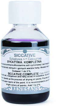 Směs soli, manganu a kyselin v terpentýnu. Sikativ je určen k míchání s olejovými barvami, urychluje proces jejich schnutí. Vhledem k černé barvě je vhodný pro tmavé odstíny, nedoporučujeme používat pro svělté odstíny (bílá, žlutá, apod.).