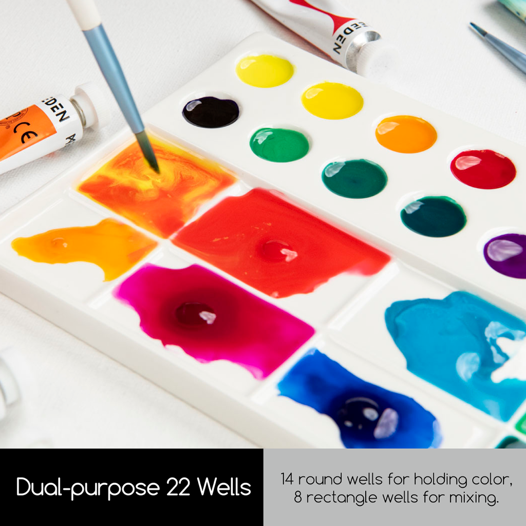 Porcelánová paleta obdélníková 22 důlků 14x19cmKeramická paleta vyrobená z prémiového ekologického materiálu určená pro akvarelové, kvašové, akrylové i temperové barvy. Paleta má dvě části - hladkou s 8 oddíly a 14 menších kulatých důlků. Paleta se snadno čistí, je odolná proti skvrnám, pevná a trvanlivá.