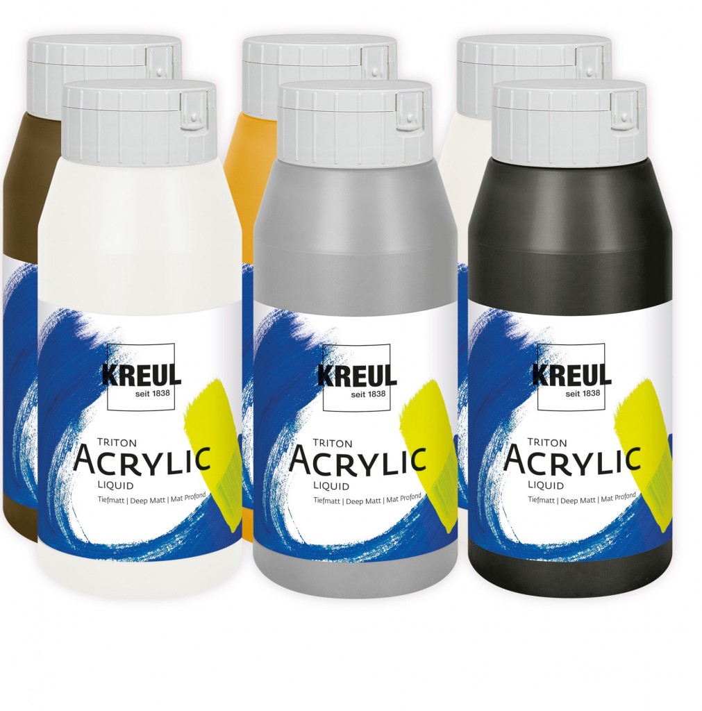 Sada akrylových barev Kreul Triton 6x750ml – Neutral ColorsUmělecké akrylové barvy Triton od německého výrobce Kreul představují středně kvalitní barvy za velmi výhodnou cenu. Jsou tak zvlášť oblíbené ve školách, na kurzech a různých hromadných akcích, kde je potřeba hlavně velký objem. V čerstvém stavu jsou vodou ředitelné, po zaschnutí naopak voděodolné. Vyrábí se na bázi akrylové disperze, která dává barvám charakteristickou krémovou konzistenci. Pigmenty jsou i při nízké ceně zastoupeny v poměrně vysoké koncentraci a zajišťují výraznost a světlostálost všech odstínů.