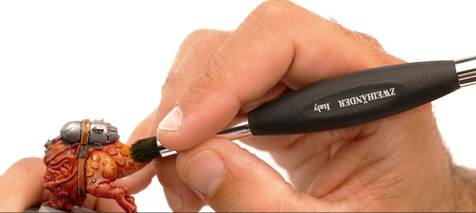 ZWEIHÄNDER – oboustranný štětec pro drybrush, stippling a techniku slapchop: na jedné straně úhlový hrot z dvou typů vláken, na druhé kompaktní kulatý hrot z hustých syntetických štětin pro jemné a realistické efekty, stínování,i blendování.