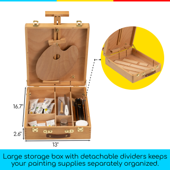 Stolný kufríkový stojan Meeden 6036Stojan na stôl z bukového dreva s úložným priestorom. Slúži ako stojan na maľovanie na plátno a na kreslenie. Má nastaviteľnú výšku plátna vďaka posuvnej hornej tyči. Povrch puzdra je hladký s brúsenými hranami. Vnútro regálu je vybavené tromi odnímateľnými priehradkami. Jeho veľkou výhodou je kompaktnosť, stojan sa jednoducho zloží do malého puzdra a môžete si ho vziať so sebou. Stojan oceníte pri práci v štúdiu aj doma.