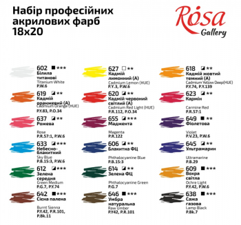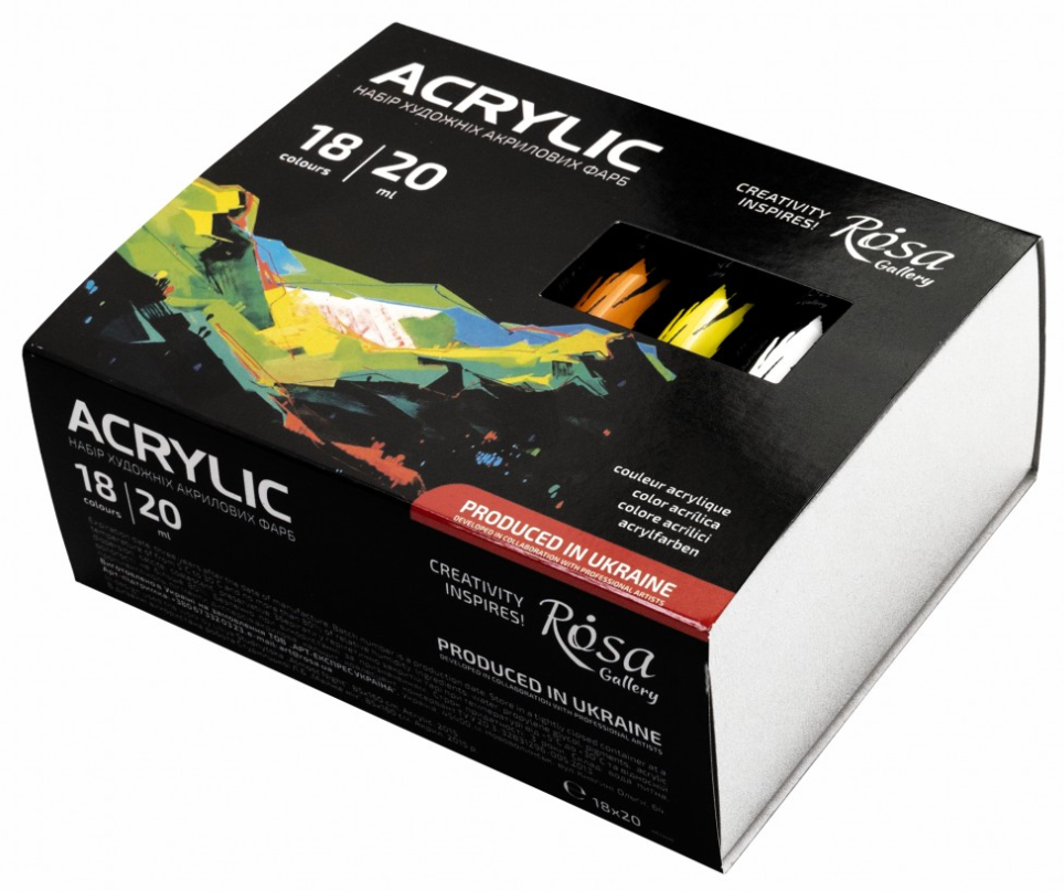 Sada akrylových barev Rosa Gallery 18x20mlUmělecké akylové barvy Gallery od ukrajinského výrobce Rosa představují kvalitní barvy vhodné jak pro začátečníky a amatéry, tak i pro zkušené umělce. Při jejich vývoji firma Rosa spolupracovala velmi úzce s řadou umělců, díky čemuž barvy odpovídají dnešním standardům. Vyrábí se na bázi akrylové disperze, která dává barvám charakteristickou krémovou konzistenci. Pigmenty jsou zastoupeny ve vysoké koncentraci a zajišťují výraznost a světlostálost všech tónů. Výhodný poměr cena / kvalita.